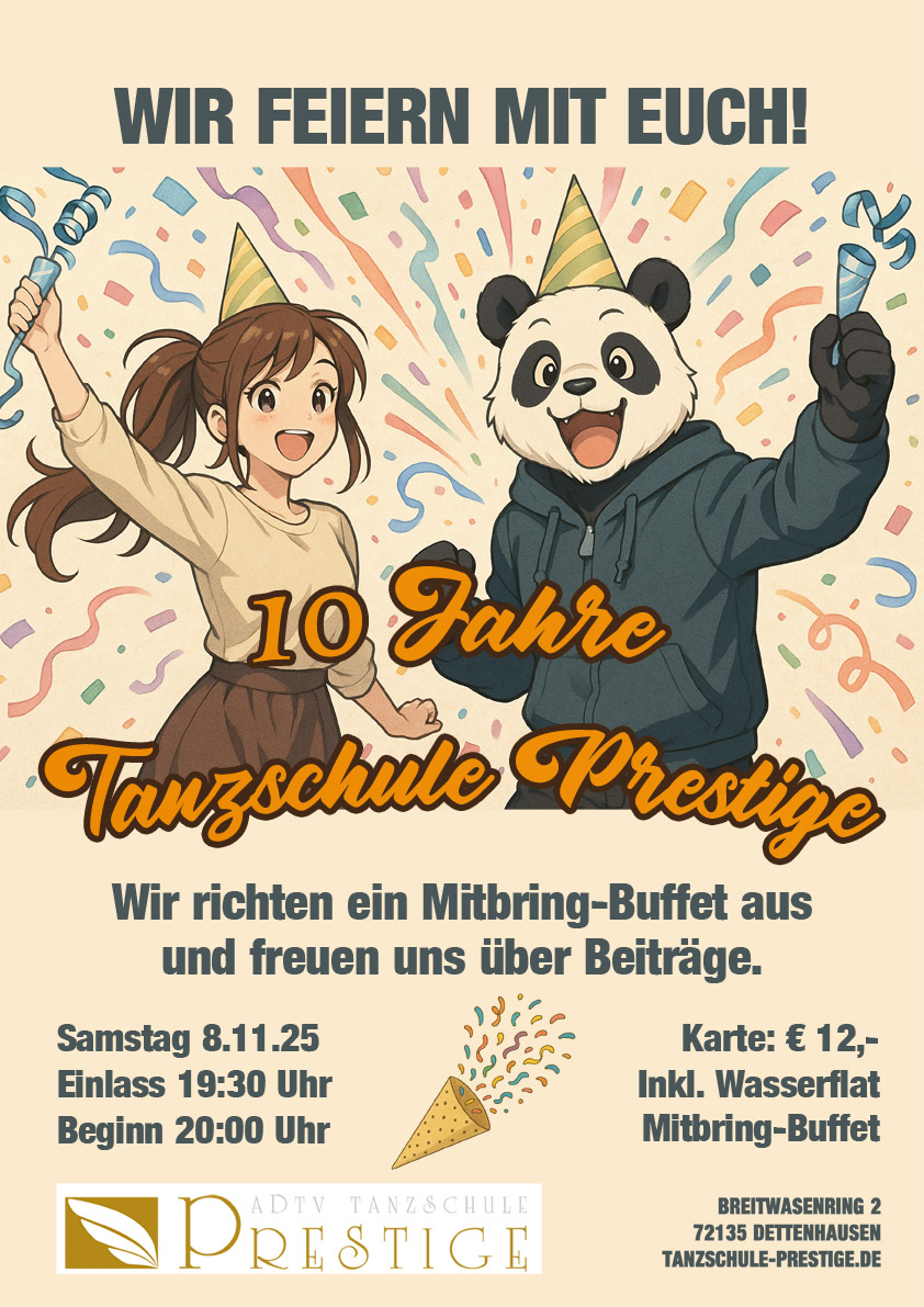 In dieser Zeit haben wir mit euch so viel erlebt: erste Tanzschritte und große Fortschritte, Workshops, Tanzabende und vor allem viele neue Freundschaften. All das möchten wir mit euch feiern – mit Musik, guter Stimmung und ganz viel Herz.